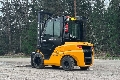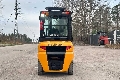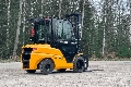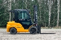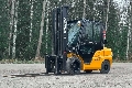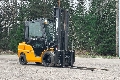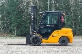 Diesel-powered forklift truck with a closed cabin and 3500 kg lift capacity. Three-stage mast with free lift, maximum lift height 5500 mm. Drive height 2560 mm. Fork positioner and spread. Also available to rent.