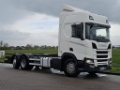 Number of axles: 3, Configuration: 6x2, Total fuel capacity: 1100 litre, 2nd fueltank, Trailer coupling, Kingpin size: 40 DIN, fifth-wheel: Fixed, Diff. locks: 1, Suspension type: air suspension, Cabin type: Sleeping cabin, Cruise control, Tacho, Digital tachograph, Airconditioning, Parking Airco, Parking heater, Electric windows, Electric mirrors, Radio/cassette, Color: white, Heated mirrors, Lighting type: Led lamps, Laneassist, Climatecontrol, Seat heating, Bluetooth, Fuel type: diesel, Euro: 6, Gearbox kind: Opti-cruise, Gearbox make: Scania, Number of Gears: 12, Add. break system, Retarder make: Scania, Power steering, ABS, ASR, Starter battery, Systemlength: 80 cm, Central locking, Seats configuration: 1+1, Seat cover: cloth, Chair adjustment: Manually