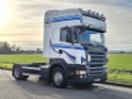 Number of axles: 2, Configuration: 4x2, Total fuel capacity: 700 litre, Fifth wheel height: 109 cm, fifth-wheel: Fixed, Diff. locks: 1, Suspension type: air suspension, Cabin type: Topline, Cruise control, Tacho, Digital tachograph, Airconditioning, Parking heater, Electric windows, Electric mirrors, Radio/cassette, Color: white, Heated mirrors, Lighting type: Halogen lamps, Climatecontrol, Seat heating, Engine capacity: 324 Kw (434 Hp), Fuel type: diesel, Euro: 5, Gearbox kind: Opti-cruise, Gearbox make: Scania, Number of Gears: 12, Clutch Pedal, Add. break system, Retarder make: Scania, Power steering, ABS, ASR, Starter battery, Central locking, Seats configuration: 1+1, Seat cover: cloth, Chair adjustment: Manually